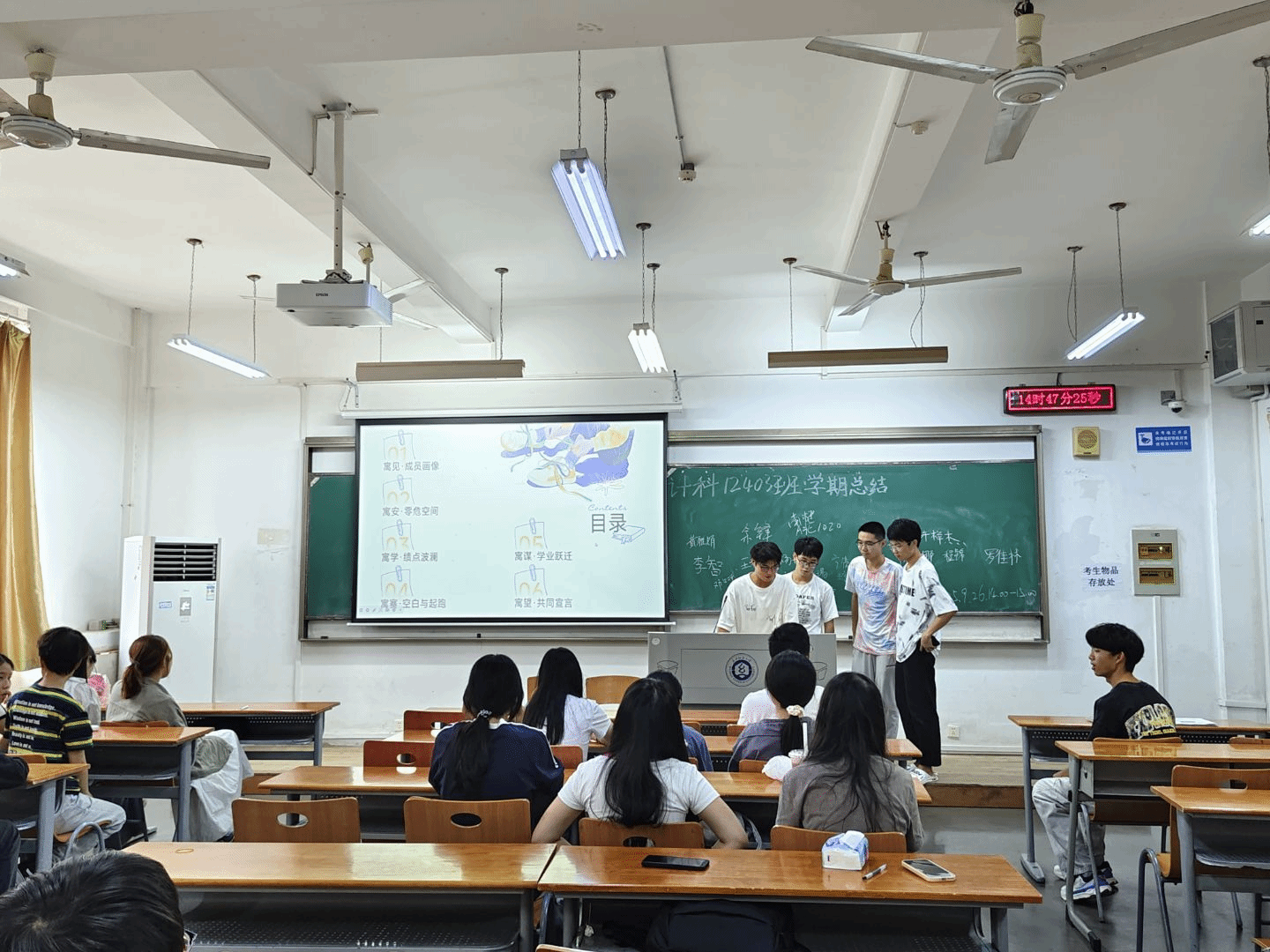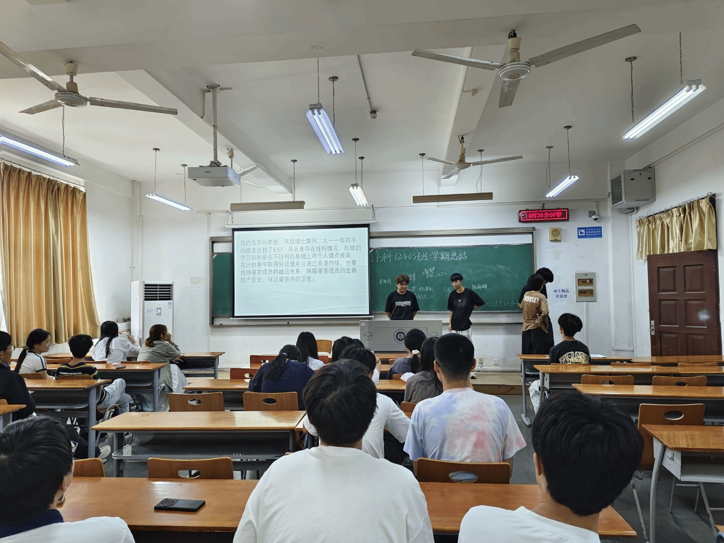 9月26日下午,计算机12403班在3号教学楼举行大一学年学期小结班会。班主任余锋、辅导员李港及全班同学共同参与,会议以宿舍为单位汇报上学期学习与生活情况,促进同学们了解不同寝室特点,互学互鉴。本次班会由班长庞翊航主持。