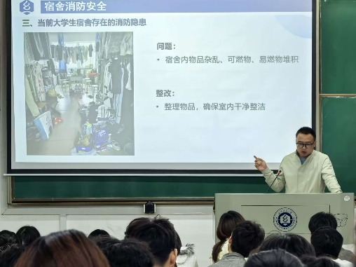 首先,与会老师进行了反诈科普宣讲,通过梳理12类常见诈骗类型,并结合学生易中招的“注销校园贷”“游戏账号交易”场景,拆解诈骗分子的话术逻辑。同时重点强调防范诈骗的“八个凡是”准则,并用“要钱不给、给钱不要”的八字口诀来帮助学生快速规避风险。随后,围绕校园消防安全展开讲解,结合3起高校真实火灾案例,列举出宿舍常见违规行为清单:使用违规电器、私拉乱接电线、长时间充电不拔等,并现场展示“不合格充电宝3C证书被撤停清单”,引导学生自查个人物品风险。最后,班会发起“安全承诺”倡议,号召学生自觉遵守宿舍安全管理规定,主动学习安全知识,共同排查身边安全隐患。![]()