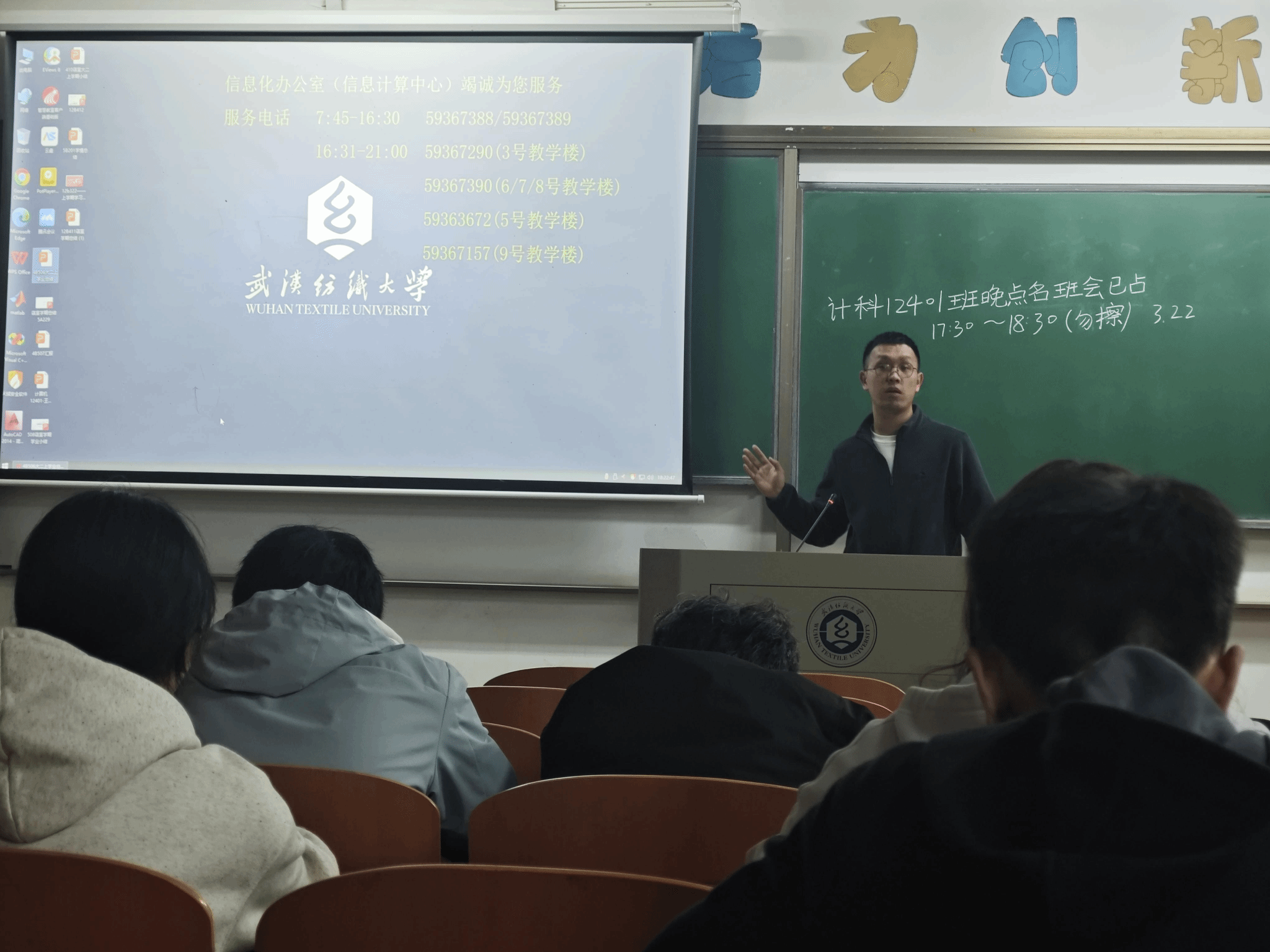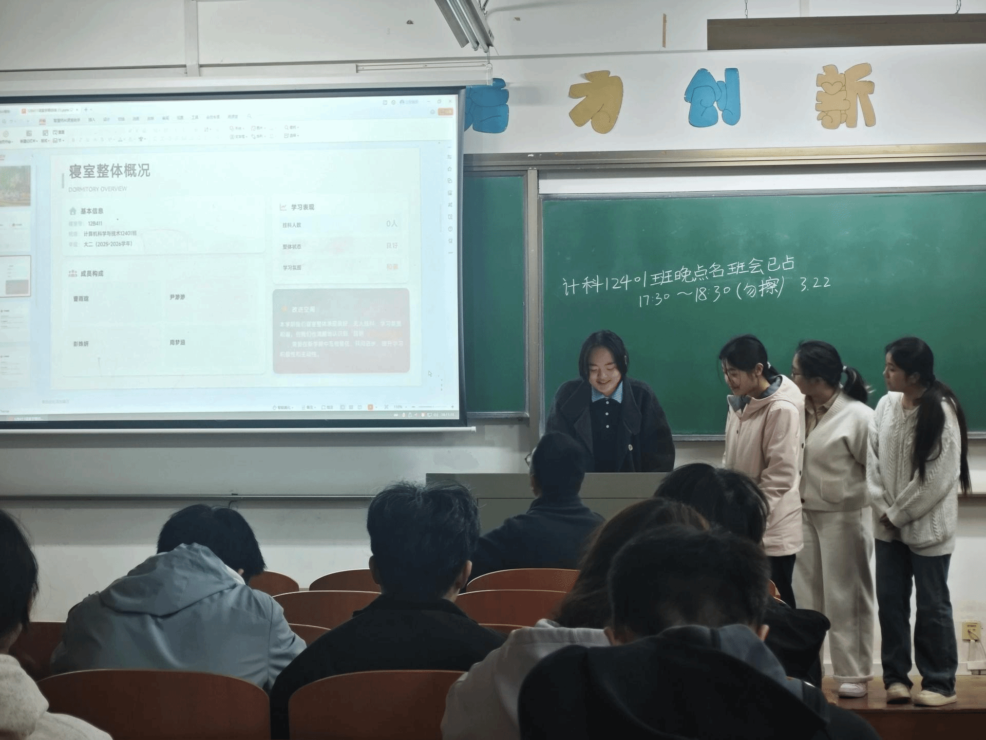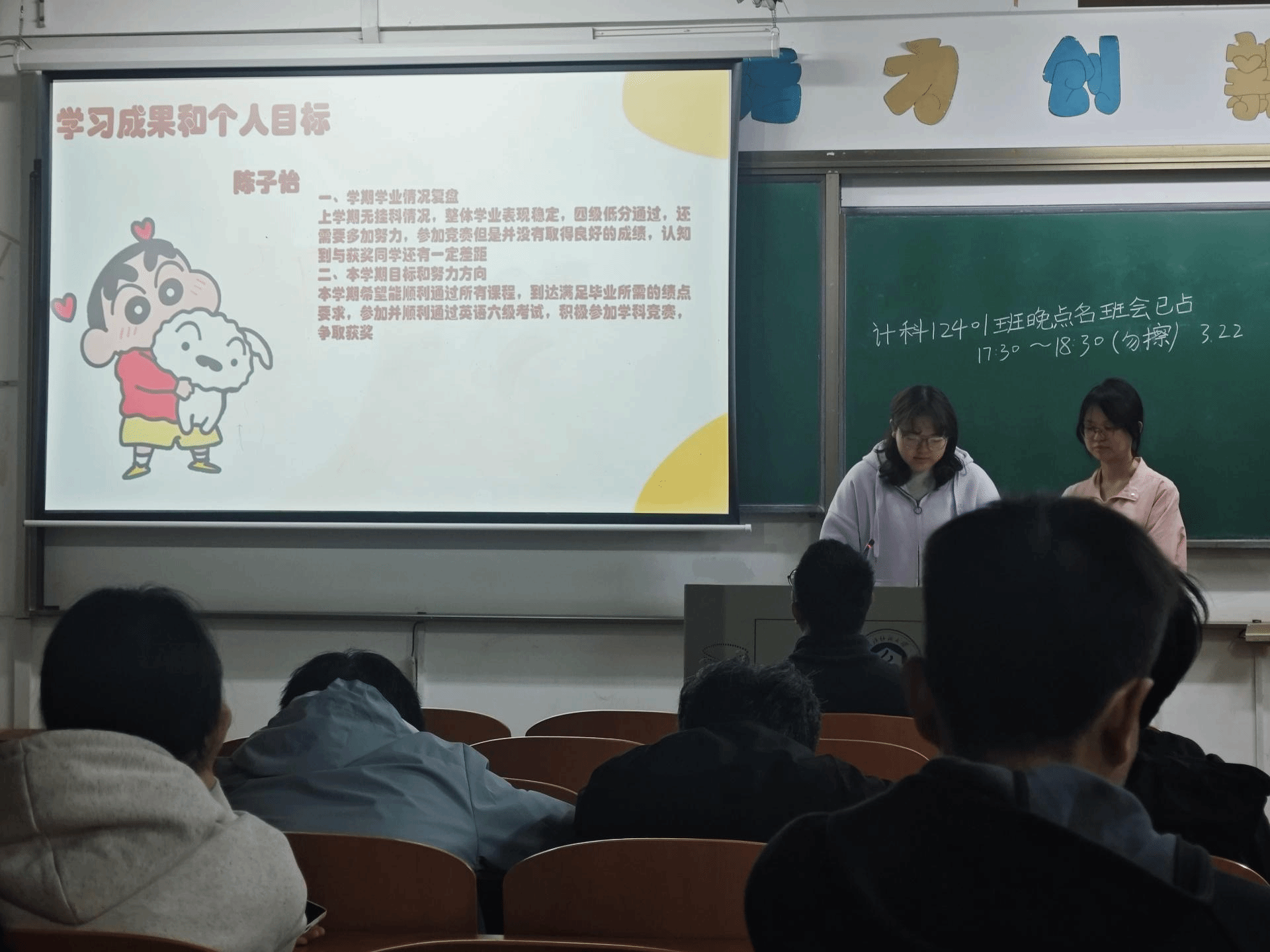 为全面复盘大二上学期班级学习历程、梳理学业成果,精准查摆学习短板,明晰后续前行方向,凝聚班级奋进力量,3月22日,威廉希尔,英国威廉希尔公司,WilliamHill官网计算机12401班在崇志楼304教室召开大二上学期学习总结班会。本次会议由班长张招招主持,班级9个寝室依次汇报学业情况、分享未来规划,辅导员李港全程参会指导。