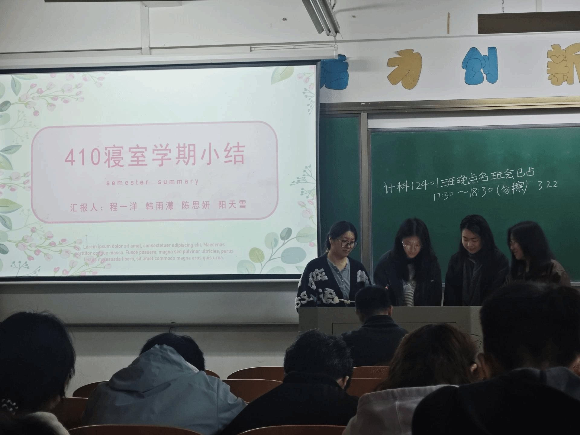 12B411寝室代表围绕寝室整体概况、成员学业情况展开汇报寝室四人全员无挂科,整体学习状态良好,寝室氛围和睦融洽。每个人都汇报并分析了自身情况,汇报中既肯定了全体成员态度端正、踏实勤学,顺利完成各项学习任务的优点,也指出了成员存在学习主动性不足、时间管理欠佳、实践能力薄弱、课堂参与度不高等问题。最后寝室定下新学期目标,立志改进学习方法、强化时间规划、提升编程实践能力,成员之间互相督促、携手共进,营造更浓厚的学风,争取更优异的成绩。