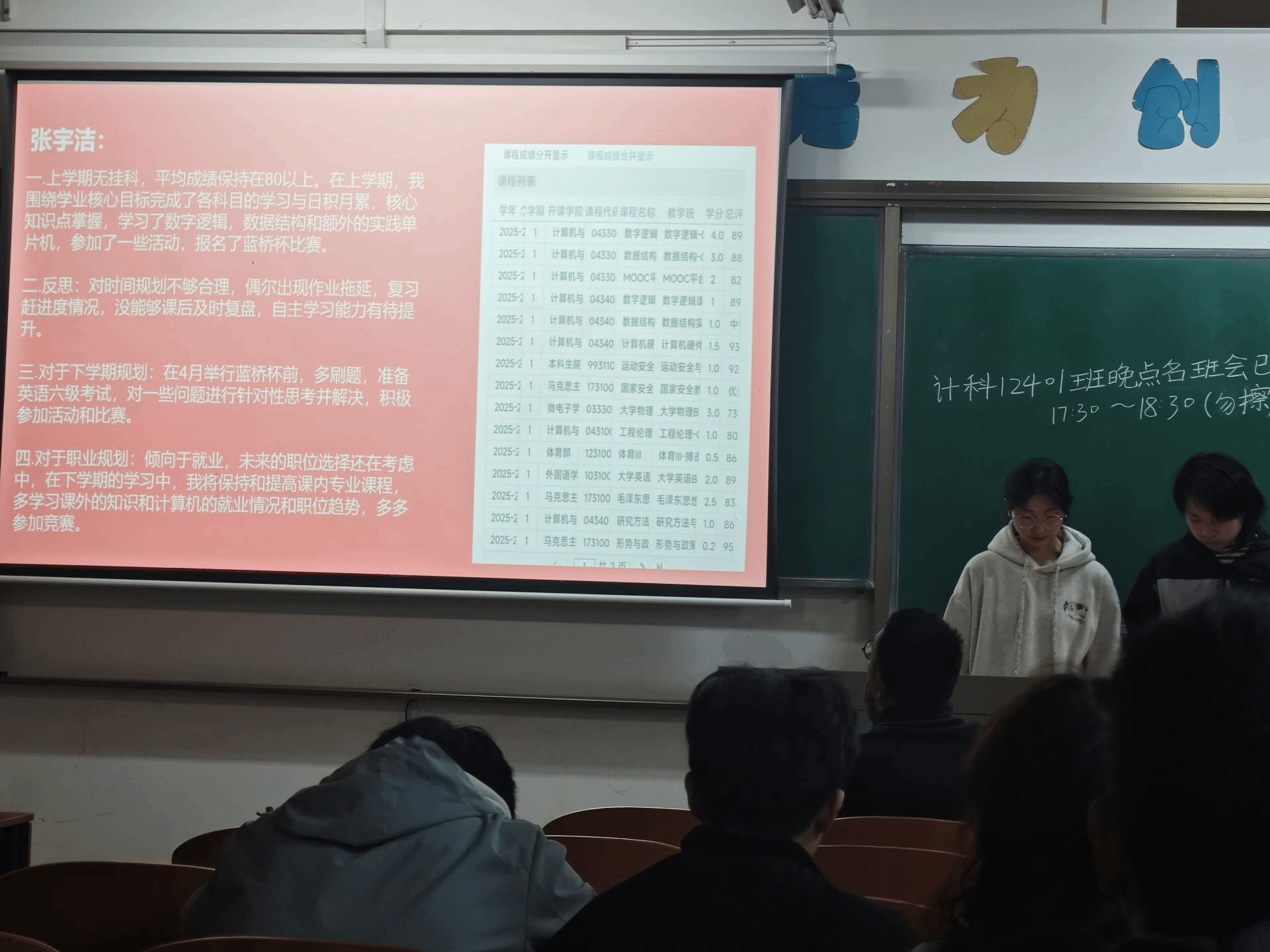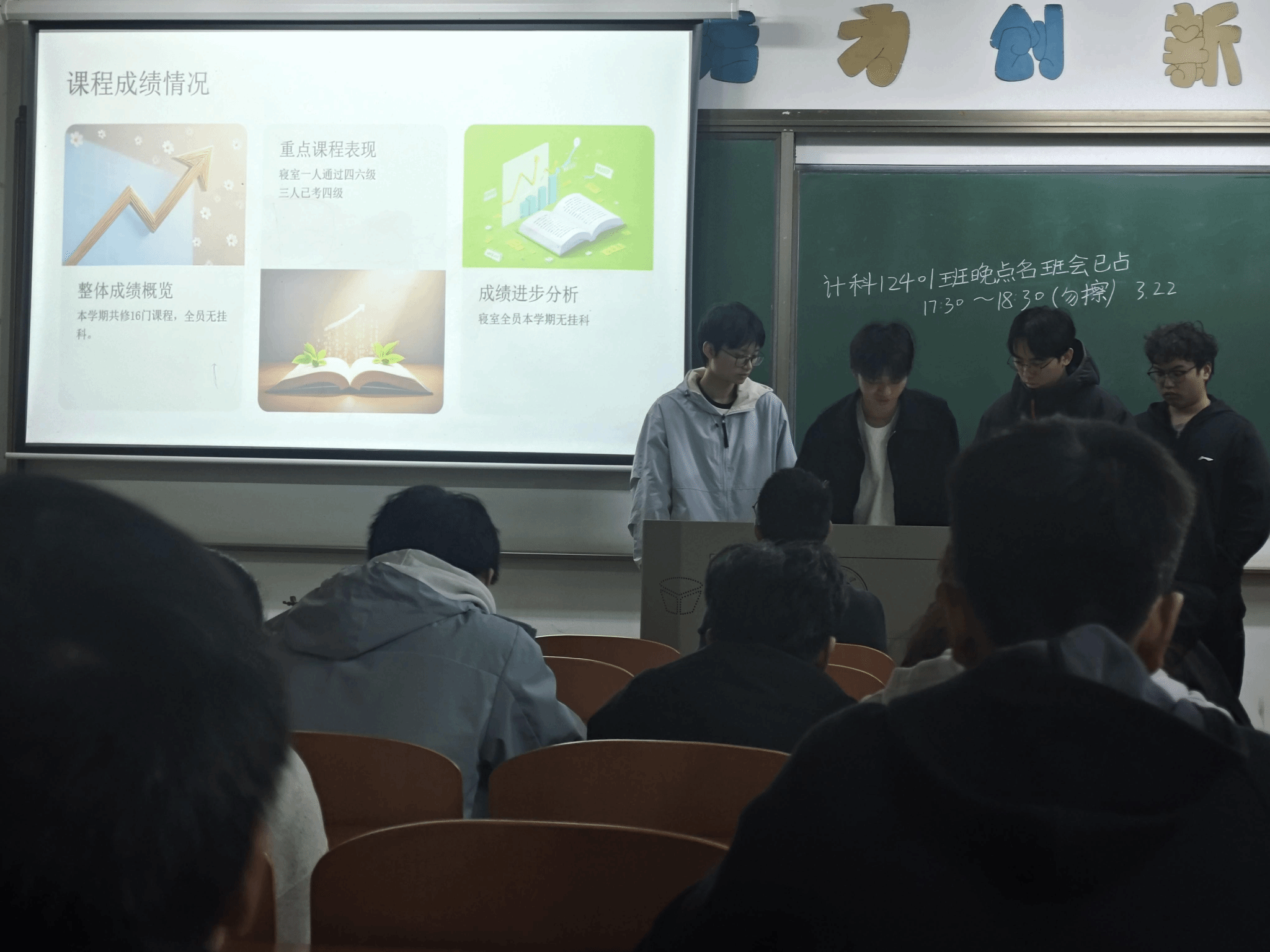 此次大二上学期学业小结班会,既是对过往学途的全面复盘,也是对新学期征程的有力动员。各班寝室坦诚剖析得失、分享实干经验,辅导员精准点评、悉心指引,让全体同学认清短板、明晰前路、凝聚合力。往后,计算机12401班全体同学将带着此次会议的收获,摒弃懈怠、笃实勤学,寝室之间互促共进,同学之间互帮互补,以严谨踏实的学风深耕专业,以清晰笃定的规划奔赴未来,同心聚力打造优良班风学风,在大二下学期稳步奋进、不负韶华。
