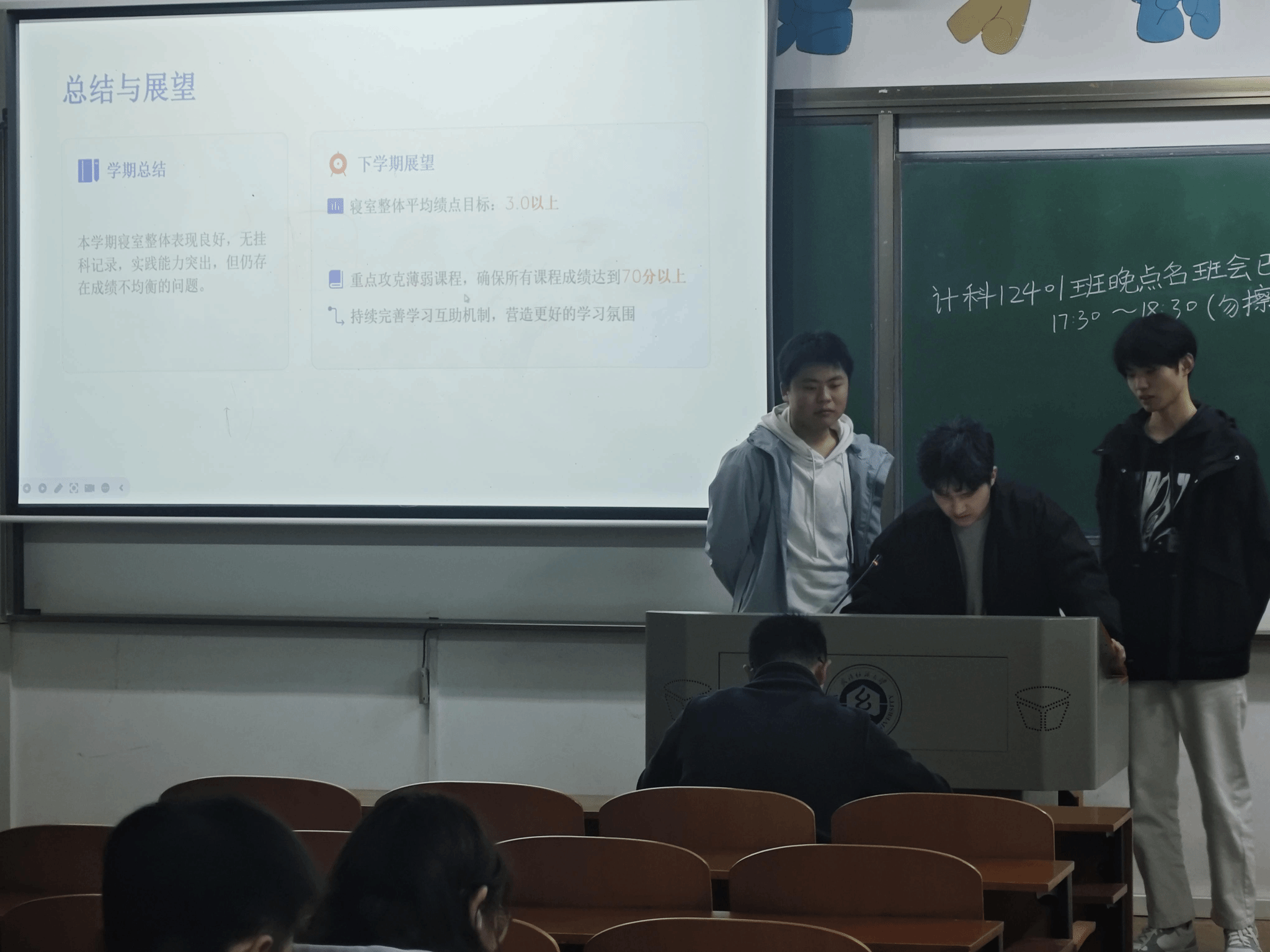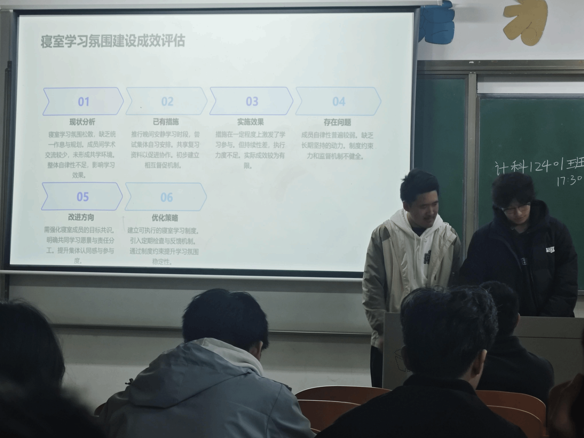 按照抽签排序,各寝室依次展开汇报,其中男生寝室率先登场、有序分享。汇报过程中,各男生寝室代表紧扣学期学习核心,聚焦专业知识掌握、课堂出勤表现、作业完成质量等关键方面,既坦诚梳理了自身及寝室在学习中存在的不足,也分享了彼此互助学习、共同进步的实用经验,同时结合专业学习特点,明确了后续查漏补缺、深耕专业的具体计划。