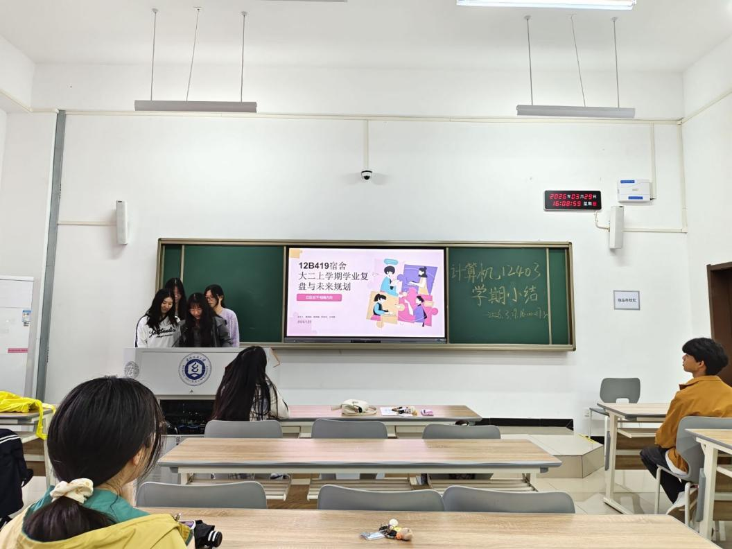 12B415宿舍汇报,上学期成员紧密协作、互相督促,课堂专注、课后交流,无挂科情况,专业与实践能力均有提升。未来将以更明确的目标、更自律的态度,夯实基础、参与竞赛,携手共进。