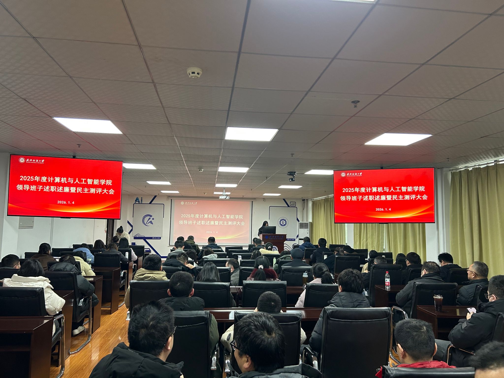 会议严格按照学校年度考核工作规范开展,首先由学院领导班子成员依次作述职述廉报告,聚焦"德、能、勤、绩、廉"五项标准,全面复盘2025年度分管工作。院长胡新荣重点汇报了学院学科建设与科研攻坚成果,详细介绍了学院在人工智能领域的突破,团队研究成果及学科发展中存在的交叉融合深度不足等问题,明确2026年将重点培育交叉创新团队,推进"AI+X"人才培养模式改革。