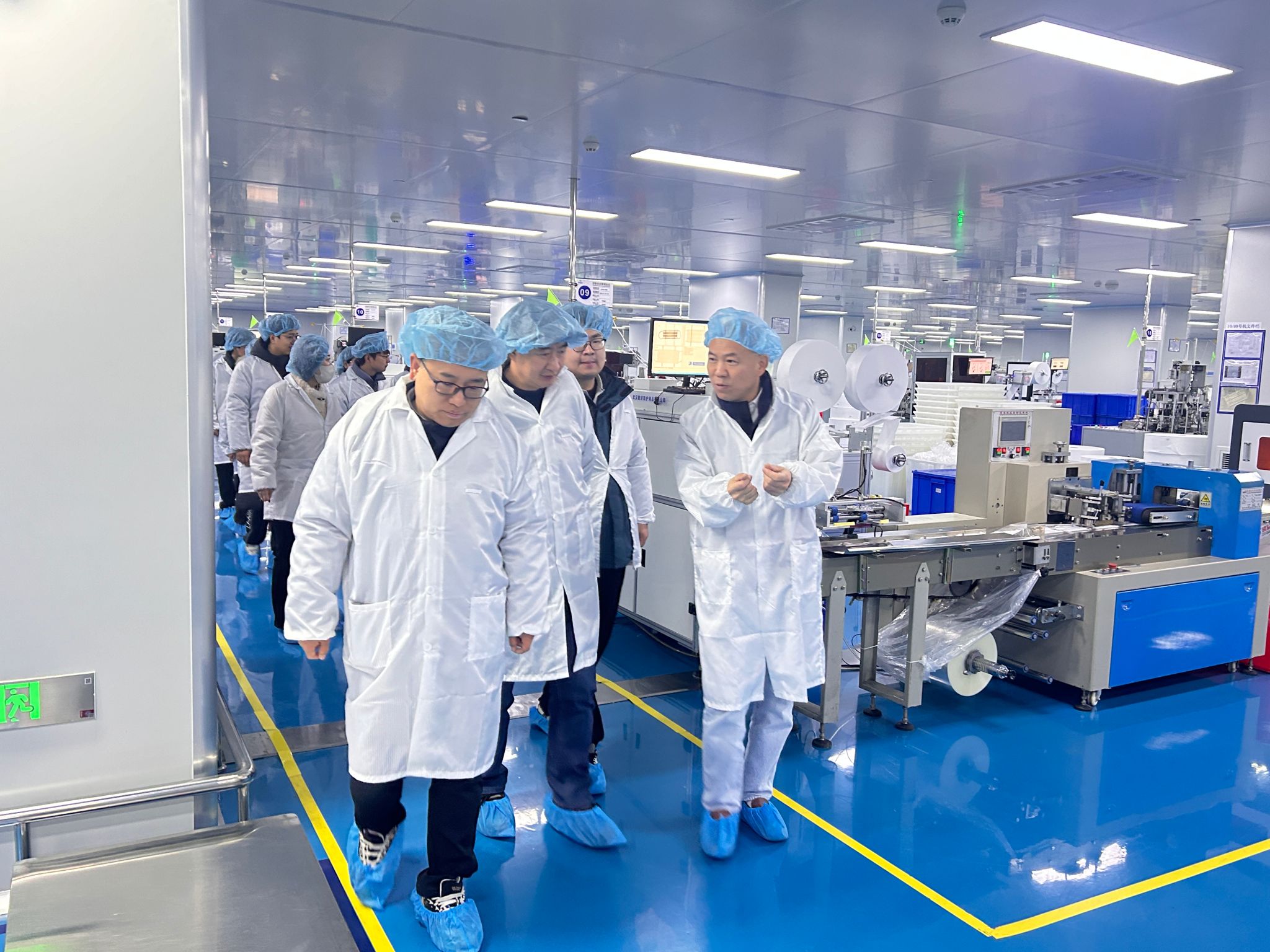 何儒汉教授团队深入联好防护生产车间,实地考察了口罩、防护服等产品的生产全流程。何教授指出,人工智能技术在纺织行业具有广阔应用前景,尤其在工业机器人、视觉质检、动态排程优化、设备智能运维等方面可发挥关键作用,为传统纺织注入创新动能。