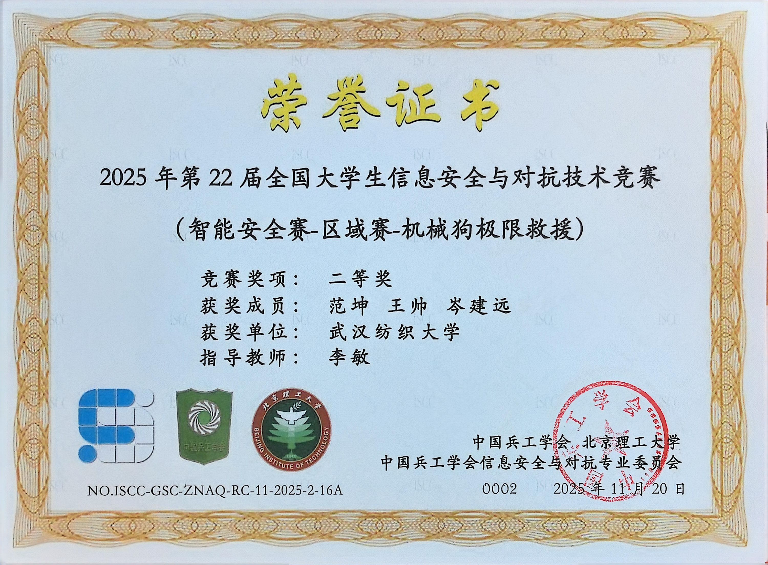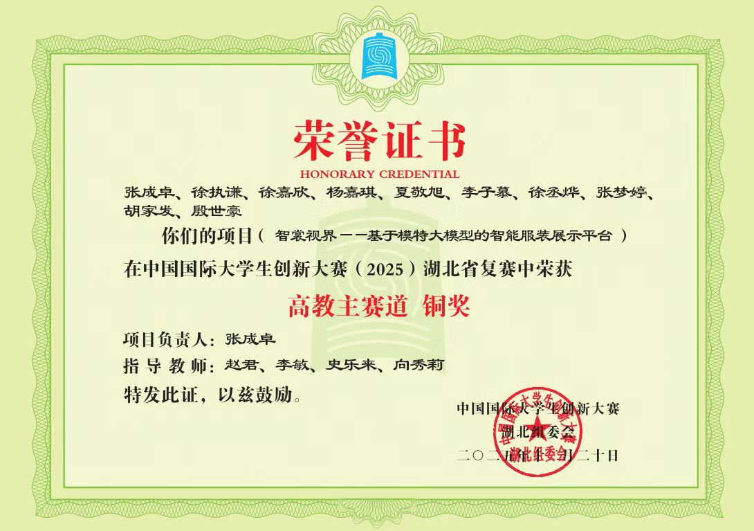 李敏教授在指导学生学科竞赛方面成果亮眼。她指导的学生团队凭借“机械狗极限救援”项目,在第 22 届全国大学生信息安全与对抗技术竞赛中斩获二等奖;同时,她携手经济学院赵君老师联合指导的 “智裳视届 —— 基于模特大模型的智能服装展示平台” 项目,在中国国际大学生创新大赛(2025)湖北省复赛高教主赛道中荣获铜奖。